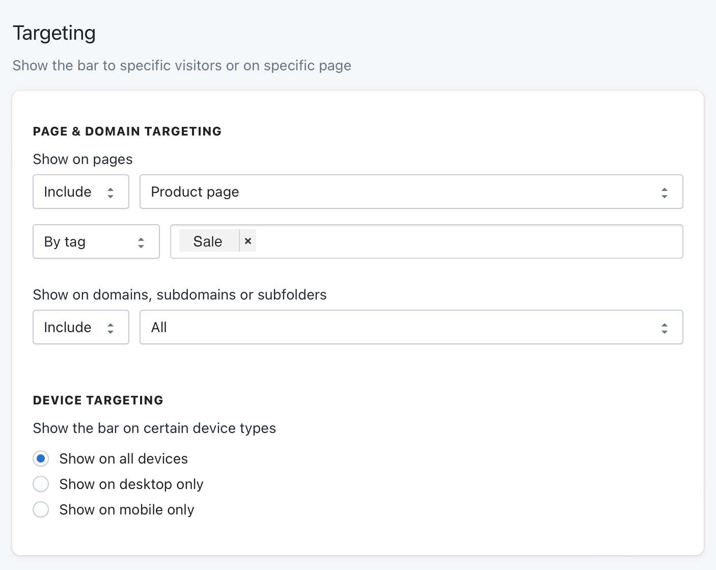 So how does this work? it’s simple, instead of choosing which products you want to display your bar on; simply target the product’s tags or vendor. For example, you can target the tag ‘Sale’ and when you add a new product to your sale collection, just add the ‘Sale’ tag to that product in Shopify and the bar or banner will be automatically displayed on that product. Or remove the tag from Shopify and the bar or banner will stop showing up on that product.